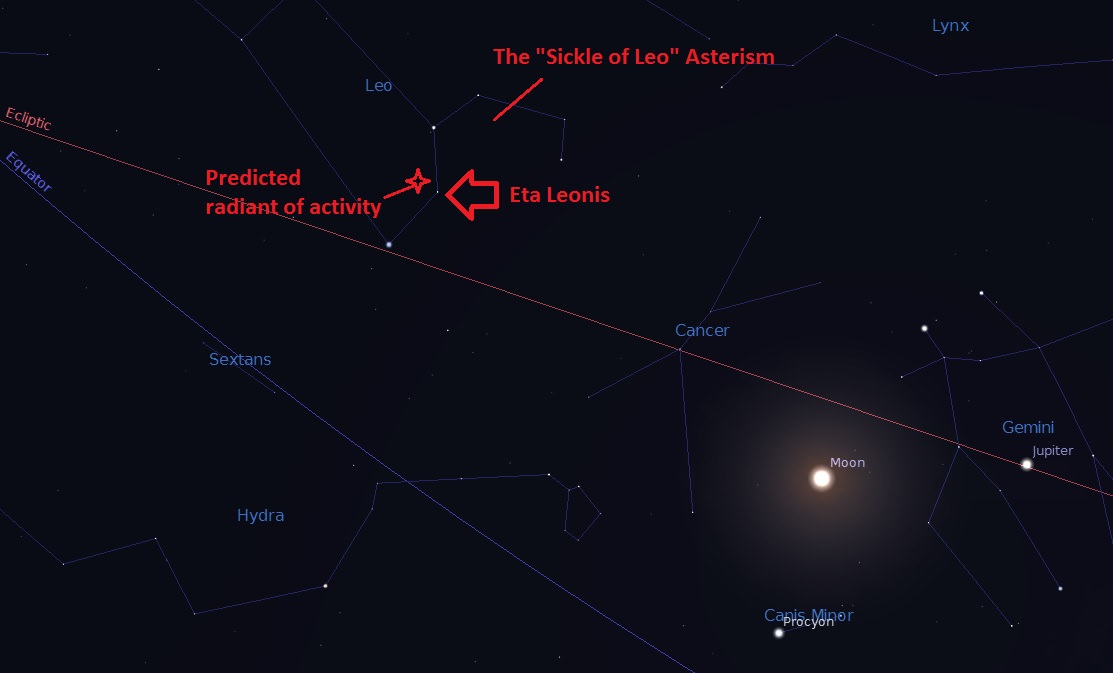 The radiant to watch for any possible "ISON-ids" sits near the +3.5 magnitude star Eta Leonis in the sickle of Leo. Robert Lundsford of the American Meteor Society notes in a