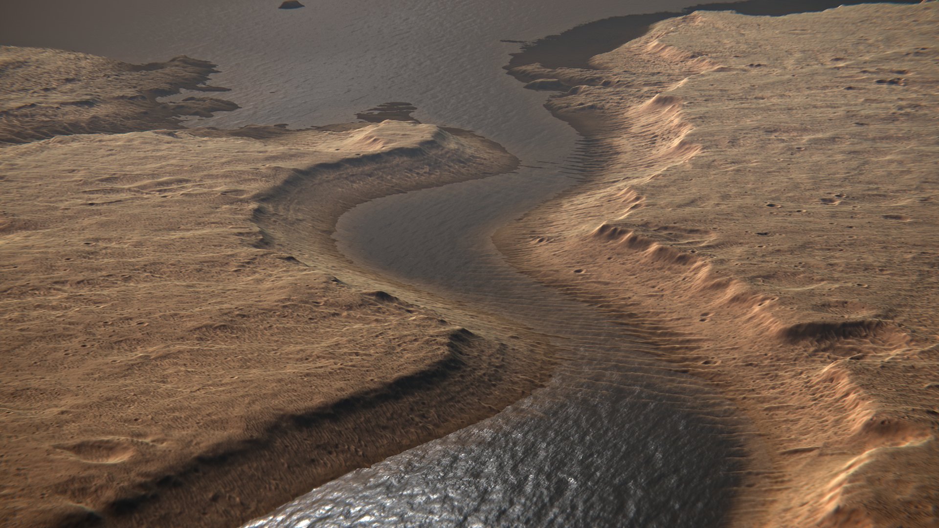 Kevin's rendition is therefore quite fitting. Not only do we see water moving through this ancient valley, there are ripples on the surface that indicate the presence of wind. Today, Martian winds are not strong enough to move anything other than particulate matter (dust). But billions of years ago, Mars is likely to have had winds that were strong enough to create surface ripples in water.