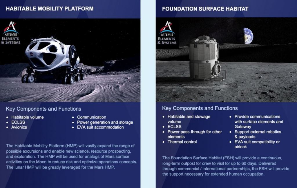 - Habitability Mobility Platform (HMP): a pressurized rover that will enable crews to take trips across the lunar surface lasting up to 45 days