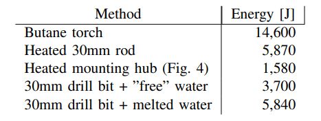 Each of the methods has their strengths and weaknesses. Each one also has its own energy requirments. The table below presents the energy required for each method to create a mounting pocket for the actuator, and to freeze it into place.