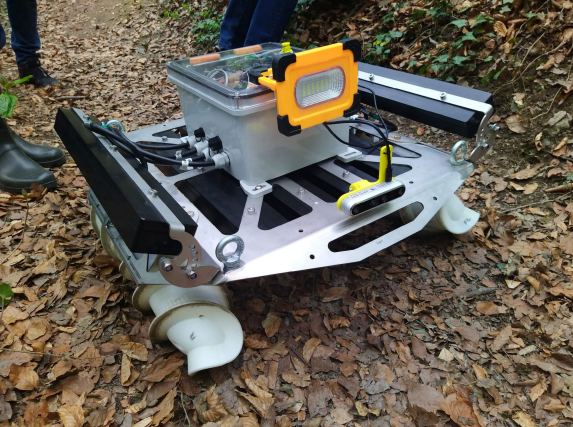 Prototype of the screw-driven robot on leafy ground.