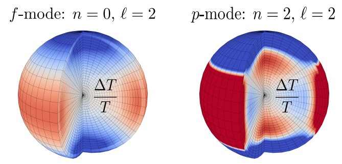 This figure helps illustrate some of the research. On the left are f-modes, which are fundamental or surface modes. They're primarily horizontal and are like surface waves on water. On the right are p-modes, which are pressure modes or acoustic modes. They're like sound waves. F-modes can measure the surface, while p-modes can measure the interior. The colours show a temperature excess (red) or deficit (blue). Image Credit: Zanazzi et al. 2025.