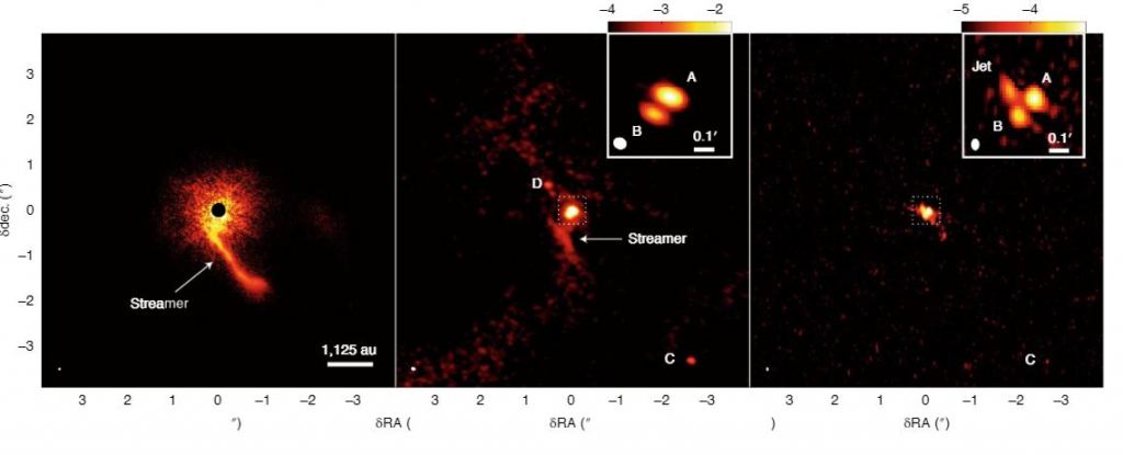 This isn't the first time astronomers have observed the stream and wondered about it. "The origin of the streamer has been a long-standing puzzle," the authors point out in their paper. Previous hypotheses for the streamer say it could be the wall of a cavity carved out by molecular outflow, a spiral arm created by gravitational instability, or the remnant of a recently-captured low-mass cloudlet.