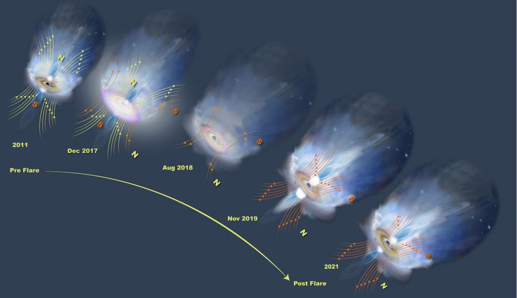 In basic terms, a magnetic field can be imaged as that of a simple magnet, with a north and south pole. A magnetic reversal is where the orientation of that imaginary pole flips, and the orientation of the magnetic field flips. This effect is common among stars. Our Sun reverses its magnetic field every 11 years, which drives the 11-year cycle of sunspots astronomers have observed since the 1600s. Even the Earth undergoes magnetic reversals every few hundred thousand years. But magnetic reversals weren't thought to be likely for supermassive black holes.