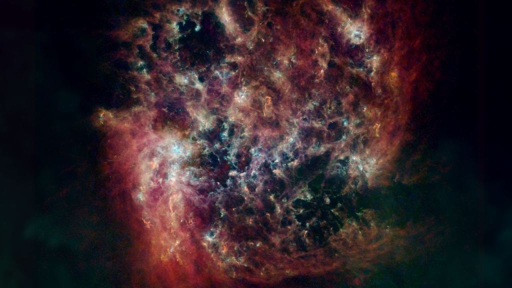 The first image is of the Large Magellanic Cloud. It shows a red tail coming off the bottom left of the galaxy that was likely created when it collided with the Small Magellanic Cloud about 100 million years ago. The areas of red indicate hydrogen, the most common element in the Universe. Where cocoons of empty space are indicates regions where stars have recently formed, because intense winds from the newborn stars blow away the surrounding dust and gas. The green light around the edges of those bubbles indicates the presence of cold dust that has piled up as a result of those winds. Warmer dust, shown in blue, indicates where stars are forming or other processes have heated the dust.