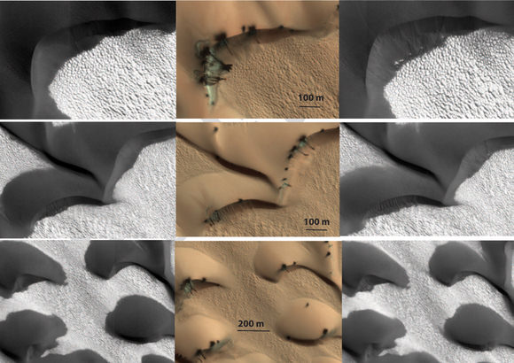 [caption id="attachment_83070" align="aligncenter" width="384" caption="Three images of the same location taken at different times show seasonal activity causing sand avalanches and ripple changes on a Martian dune. Credit: NASA/JPL/The University of Arizona."]