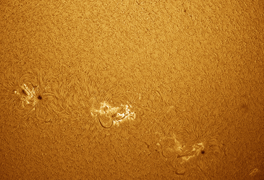 The summer Sun (for us in the northern hemisphere) is getting active! Here are images and videos of recent activity, which include sunspots and an M-class flare. Above is a close-up look at four active regions taken by César Cantú from the Chilidog Observatory in Monterrey, Mexico.