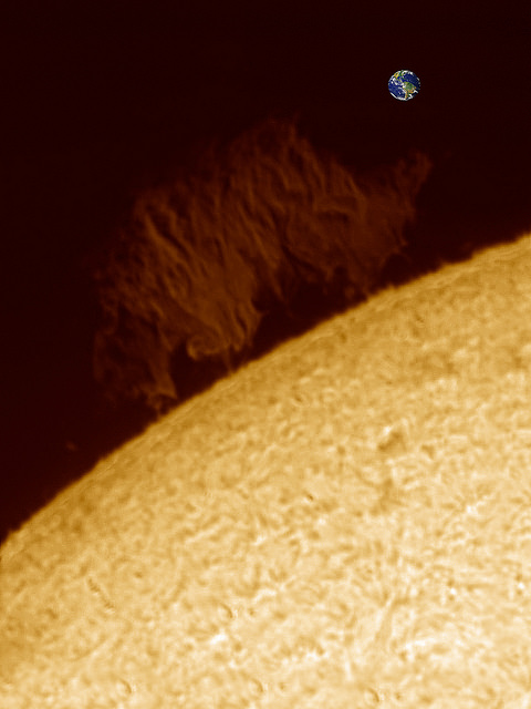 A huge wall of plasma rose from the Sun's southeast limb over the weekend, with what might be one of the biggest prominences seen in many years. César Cantu from Monterrey, Mexico, took the image above, adding an "Earth" for reference of how big this prominence really is. A solar prominence is a large, bright feature extending outward from the Sun's surface. Prominences are anchored to the Sun's surface in the photosphere, and can loop hundreds of thousands of kilometers into space.