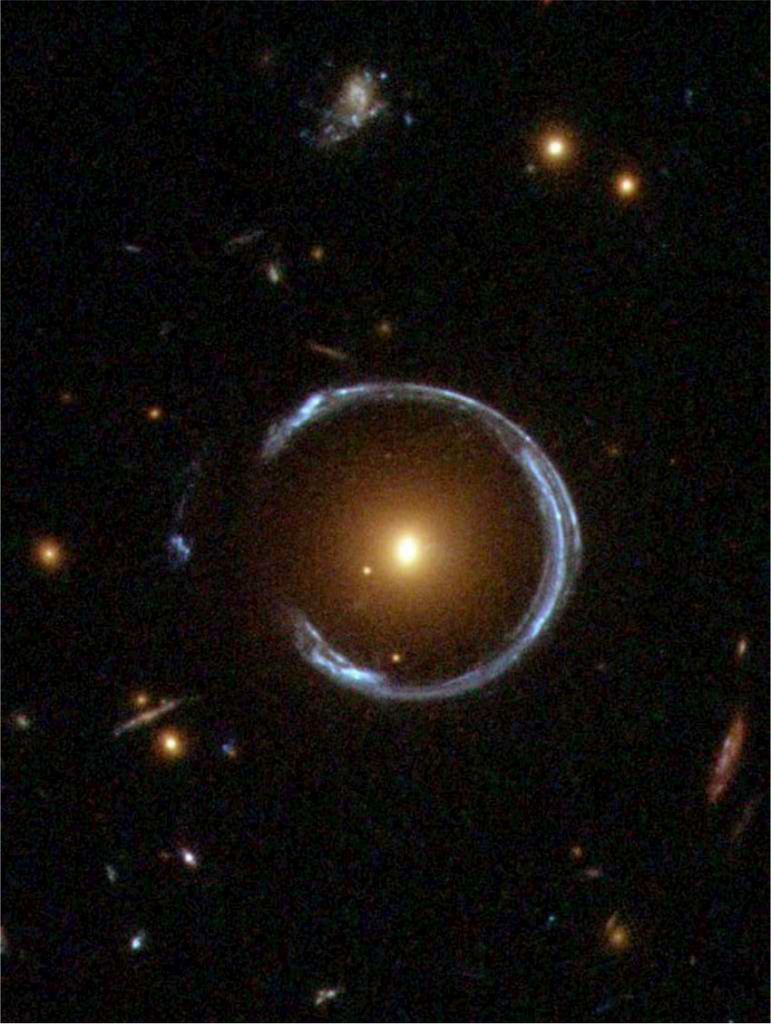 The second major cause of misalignment is the wobbling motion of the Sun . The orbit of a star's planets, especially massive gas giants like Jupiter, causes a star to wobble as its planets exert a gravitational pull. Our Sun's wobble is the largest disruption of alignment between a distant target star, the Sun, and a communication spacecraft. The craft could be fitted with an optical scope that would relay position information to the craft's guidance computer using the relative position of other stars. Alternatively, the telescope could point toward to Sun to ensure the target star from which a signal is being received is fixed in the Sun's Einstein Ring. Just as the Einstein Ring picture of LRG 3-757 above shows how a distant background galaxy shines around a closer foreground galaxy, a distant target star from which the spacecraft is receiving a transmission would appear as a ring of light encircling the Sun from the craft's perspective.
