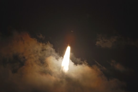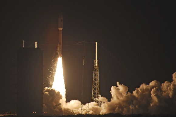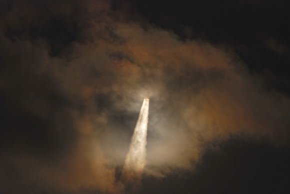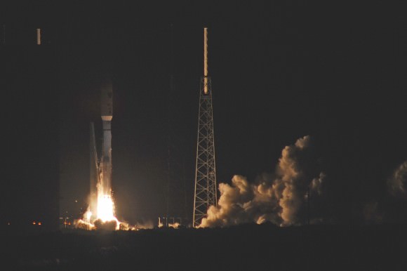 Halfway through the lightning wires, the Atlas 5 accelerates to its rendezvous with a supersynchronous transfer orbit. Credit and copyright: John O'Connor/nasatech.net.[/caption]