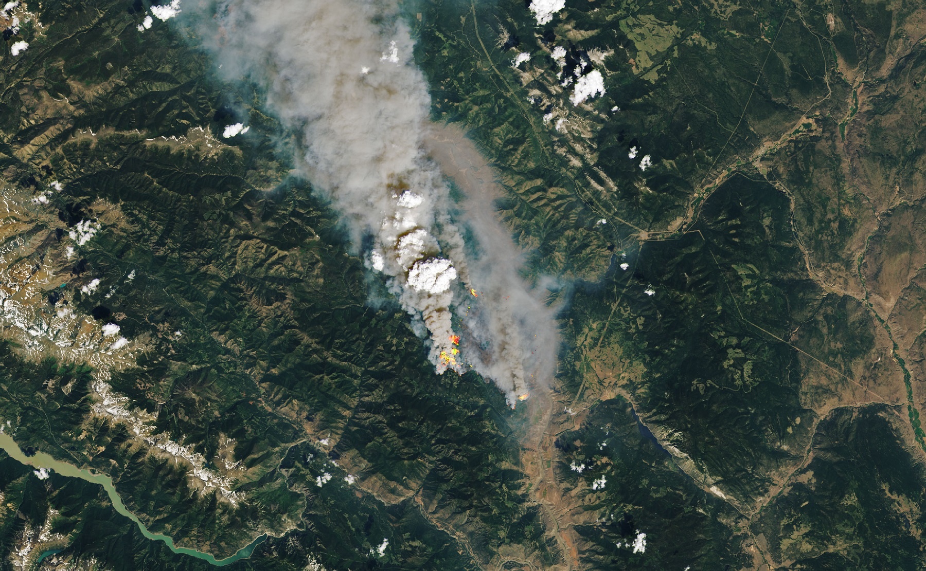 Whereas the clouds were imaged in natural color by the OLI, the flames were overlaid using shortwave infrared light data provided by the satellite's Thermal Infrared Sensor (TIRS). The fires south of Lytton would eventually move north, prompting mayor Jan Polderman sign an official evacuation order at 06:00 PM PDT (09:00 PM EDT). The residents only received 15 minutes of advanced warning because the flames were being driven by winds of up to 71 km/h (44 mph).