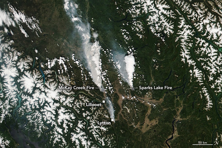 Located just 150 km (about 93 mi) northeast of the city of Vancouver, Lytton, had to be evacuated on June 30th after an extreme heatwave led to wildfire sweeping through the area. These wildfires and the impact they were having at the time was being monitored by some of NASA's Earth Observatory satellites. In a series of images recently shared on their website, they show the fires that were raging near Lytton just hours before the evacuation.