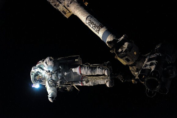 NASA astronaut Doug Wheelock anchored to Canadarm2 during an August 2010 spacewalk. He and Tracy Caldwell Dyson ventured outside three times during Expedition 24 to swap out and replace a broken ammonia pump. Credit: NASA[/caption]