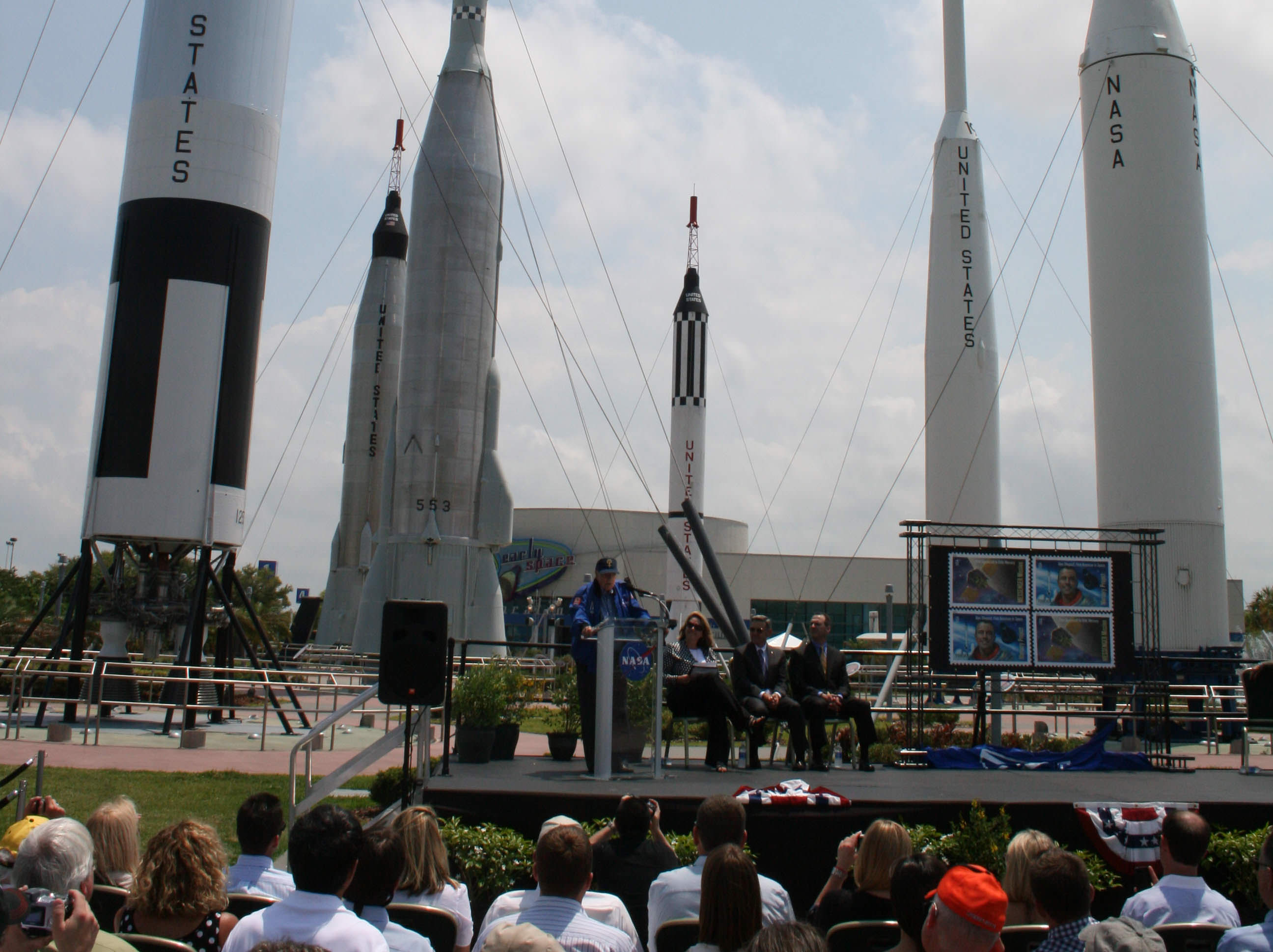 "That was largely a response to Alan's success," Carpenter told the crowd of assembled officials, journalists and visitors. Also on hand for the stamp dedication was Shepard's daughter Laura Shepard Churchly; Charles Bolden, NASA Administrator and former shuttle astronaut; Bob Cabana, KSC Director and former shuttle astronaut; and Jim Adams, NASA deputy director, Planetary Science.