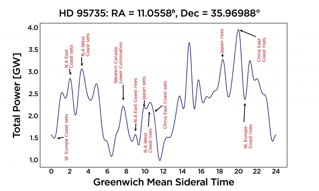 As an example, the team modeled signals as seen from three nearby stars. Alpha Centauri is in the southern hemisphere, but just 4 light-years away, so it should get a measurable signal from us. Barnard's Star (6 light-years away) and HD 95735 (8 light-years away) are in the northern hemisphere, and would likewise get good radio data from Earth. All three of these star systems are known to have planets, though none are known to have a potentially habitable world.