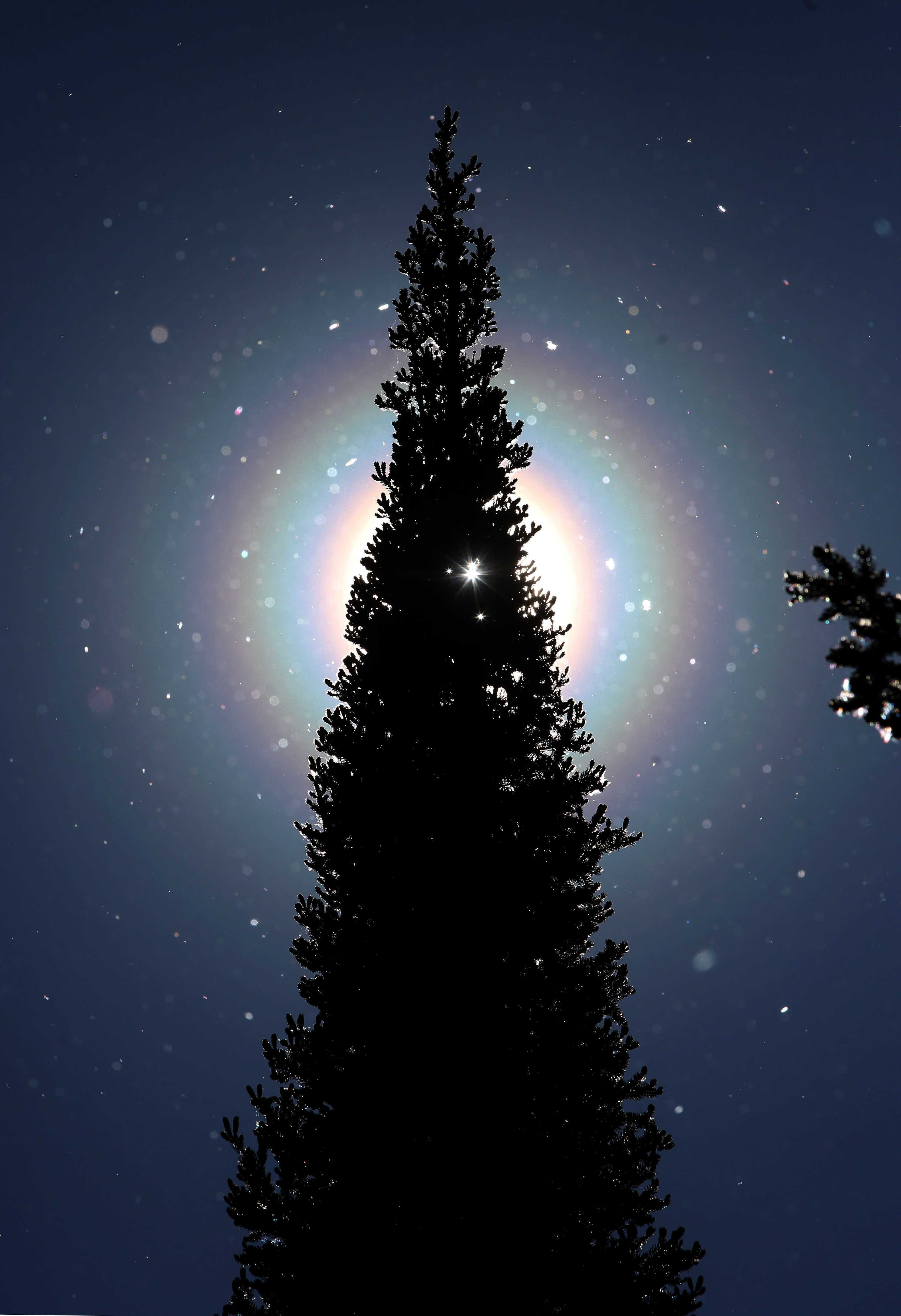 Because they're often lost in the glare of the Sun or Moon, the key to finding one is to hide the solar or lunar disk behind a thick tree branch, roof or my favorite, the power pole. Look for a telltale oval glow, sometimes tinted with rainbow colors, right up next to the Moon or Sun's edge.