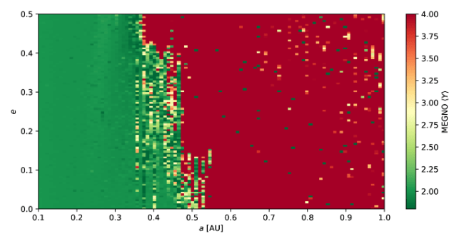 Feng used the Mean Exponential Growth factor of Nearby Orbits (MEGNO) method to test the potential stability of a super Jupiter at ? Centauri AB. First, he used it to simulate the GJ65AB system and the newly discovered planet to verify the planet's orbital stability. Then, he did the same with ? Centauri AB. "For this simulation, we restricted the semimajor axis of the planet to range from 0.1 to 5.0 au, and eccentricities less than 0.5," Feng writes.