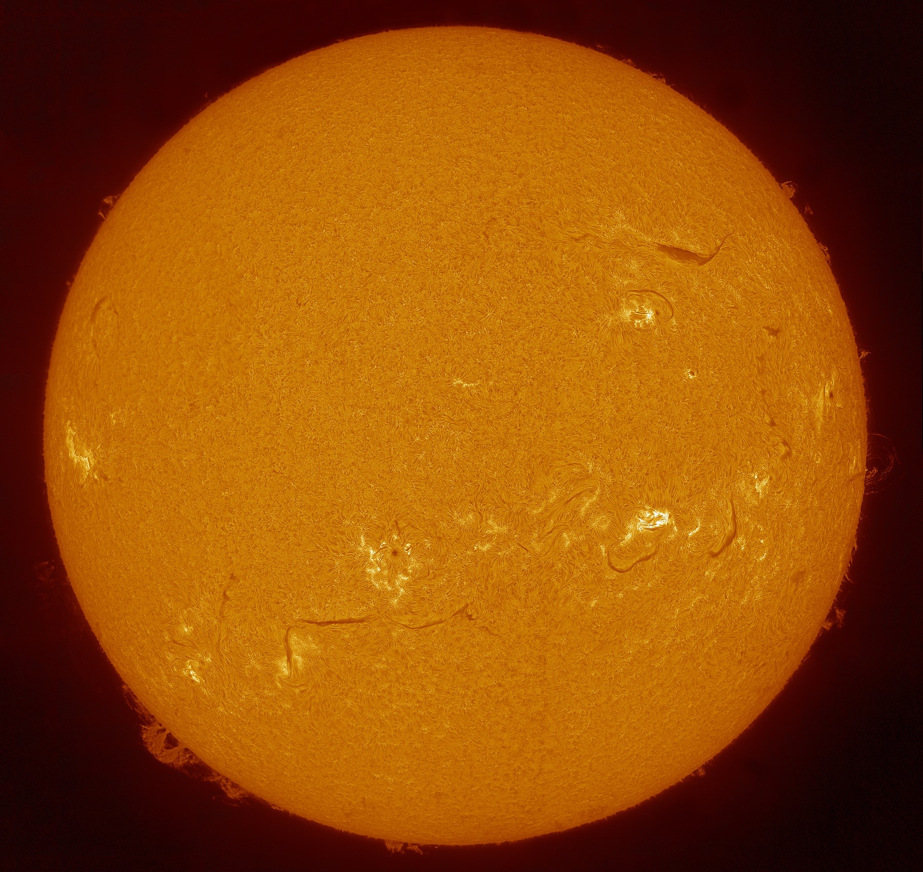 Full disk view of the Sun on August 20, 2013. The The 'small' prominences on the right side of the Sun in this image are the ones captured in the closeup image above -- not the bigger prominences on the left side. Credit and copyright: Michel Collart. [/caption]
