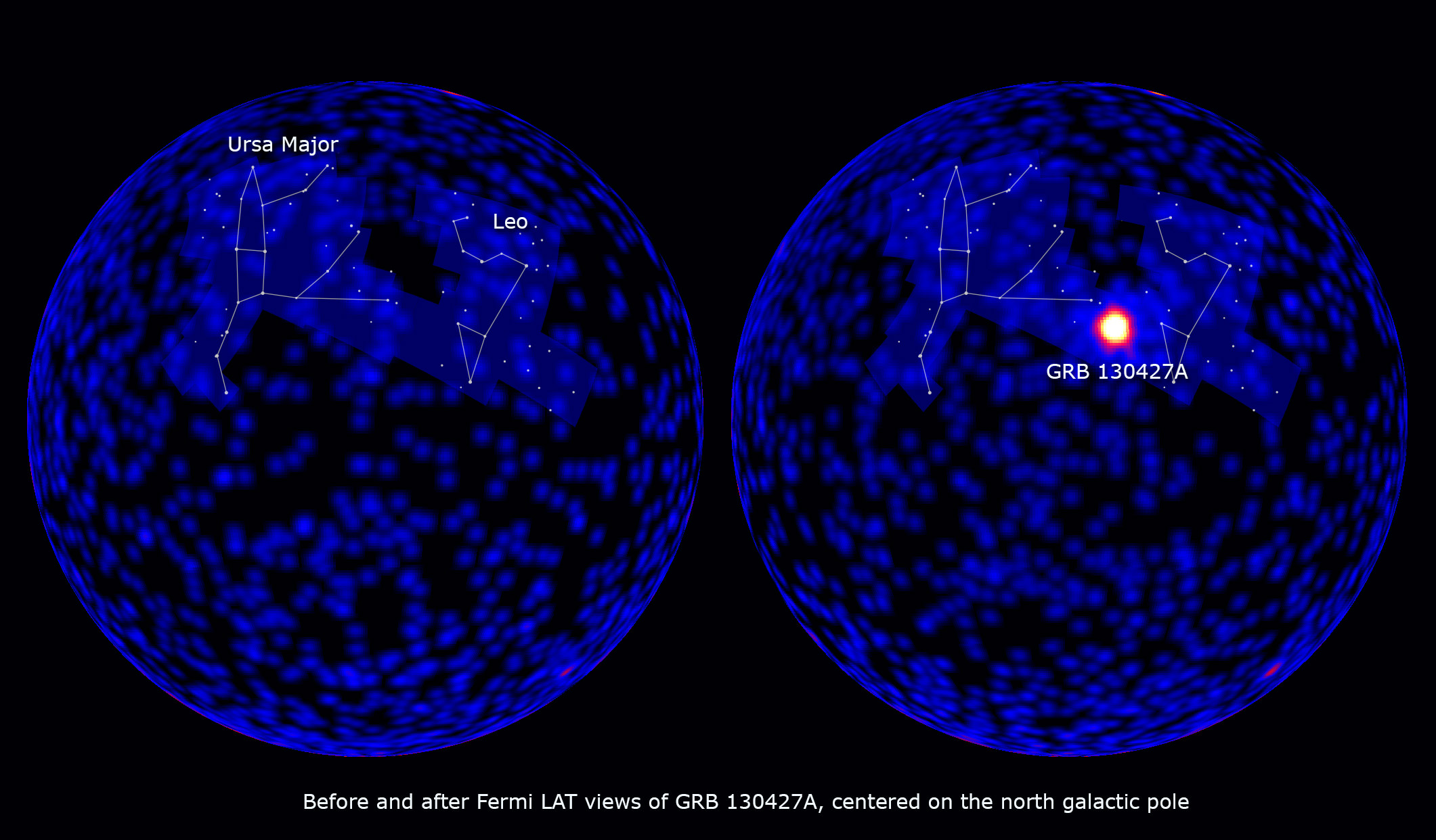 Gamma-ray bursts where first discovered in 1967 by the Vela spacecraft designed to monitor nuclear weapons testing during the Cold War. They come in two varieties: short period and long duration bursts. Short period bursts of less than two seconds duration are thought to occur when a binary pulsar pair merges, while long duration bursts such as GRB 130427A occur when a massive red giant star undergoes a core collapse and shoots a high energy jet directly along its poles in a hypernova explosion. If the burst is aimed in our direction, we get to see the event. Thankfully, no possible progenitors of a long duration gamma-ray burst lie aimed at us in our galaxy, though the Wolf-Rayet stars