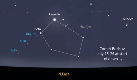 C/2013 N4 is currently traveling through Auriga not far from the easy-to-spot naked eye star Beta and will slowly brighten as it approaches perihelion - closest point to the sun - on August 20 at a distance of 113.5 million miles (182.7 million km). Unfortunately its elongation or separation from the sun will be slowly shrinking in the coming weeks, causing the comet to drop lower in the sky as it approaches perihelion. Our fuzzy visitor misses Earth by a comfortable 192.5 million miles (310 million km) on August 11. It's likely Comet Borisov won't get much brighter than 12th magnitude. Astronomers are still working out the details of its orbit, so it's possible brightness predictions could change in the near future.