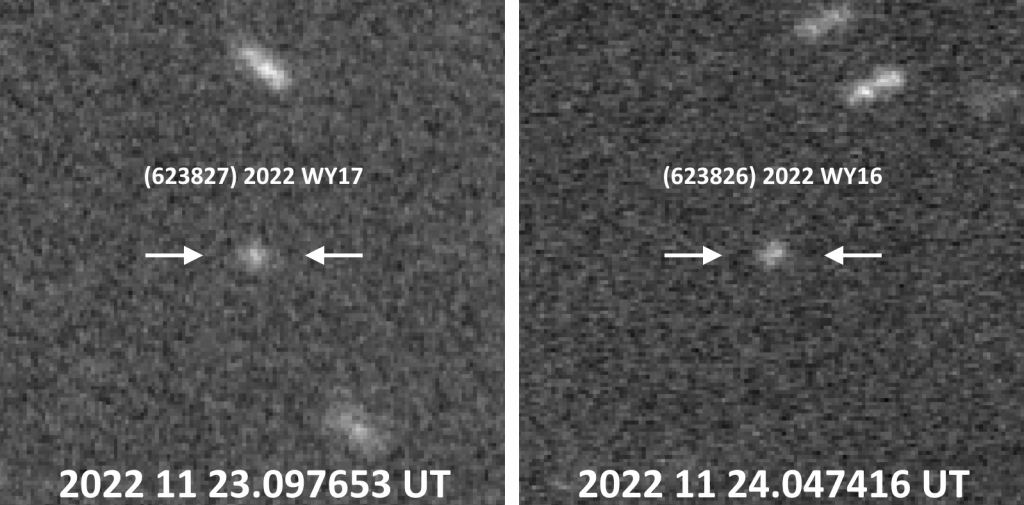 Tracking the asteroids in their orbits around the Sun is key to identification as something new. "I continued to track these asteroids for a month, and in December 2022 these asteroids received provisional designations in the Minor Planet Center database: RFD0006 was designated 2022 WY16, and RFD0004 was 2022 WY17." Both asteroids were at about +21stmagnitude at the time of discovery.