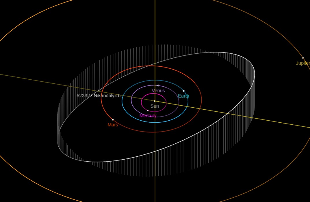 On a 5.78 year orbit, asteroid 623827 Nikandrilyich is an outer main-belt asteroid.