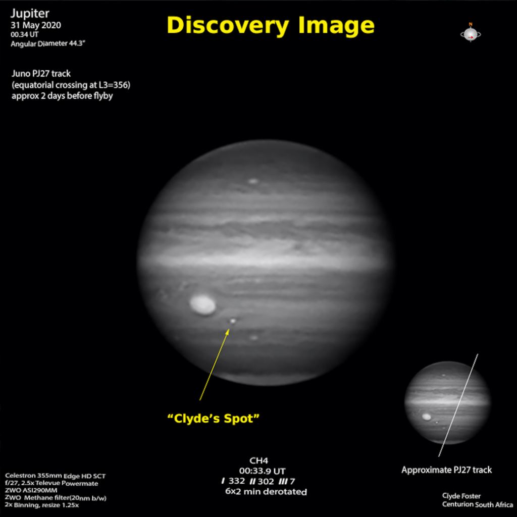 Foster observed the storm when he was observing Jupiter using a special filter on his telescope. The filter is sensitive to a wavelength of light that methane strongly absorbs, which allows the features of Jupiter to stand out. Storms such as the Great Red Spot are low in methane, so they appear bright in Foster's image. The image also shows a small bright spot below and right of the Great Red Spot, which doesn't appear in earlier images. In honor of Foster, it has been named "Clyde's Spot."