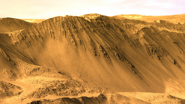 Martian sunrise over the Central Peak of Elorza Crater. Rendered using Autodesk Maya and Adobe Photoshop. HiRISE data processed using HiView and gdal. Credit: NASA/JPL/University of Arizona/USGS/image editing by Kevin Gill[/caption]