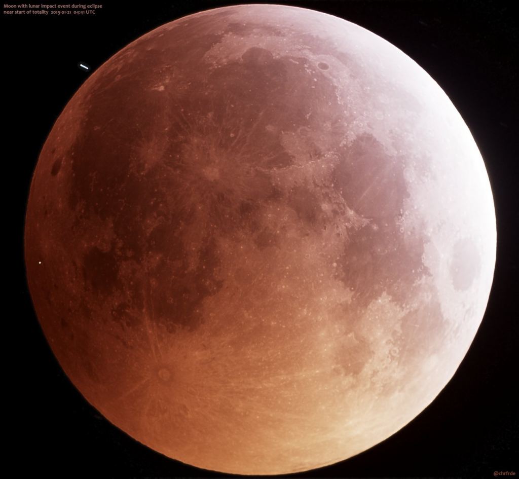 But it was actually a flash near the limb of the Moon that caught many an observer's eye. The event occurred around 4:41:43 UT on January 21st, under half a minute into totality. Discussion of the impact flash across Twitter sent many an observer (including myself) scrambling to look back over images and video... unfortunately, we had snapped stills just a minute prior to and after the event! Fortunately, lots of video was running featuring the eclipse worldwide, and soon, several videos confirmed the event.