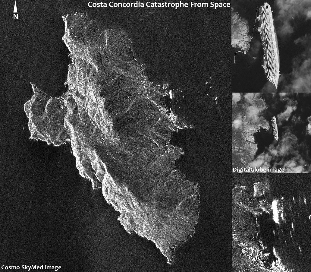 The COSMO-SkyMed space radar system provides all weather imagery and is funded by the Italian government and managed by the Italian Space Agency (ASI). [caption id="attachment_92790" align="aligncenter" width="580" caption="Satellite Close-up of Wreckage of Costa Concordia Luxury Cruise Ship of the coast of Giglio, Italy. Credit: DIGITALGLOBE "]