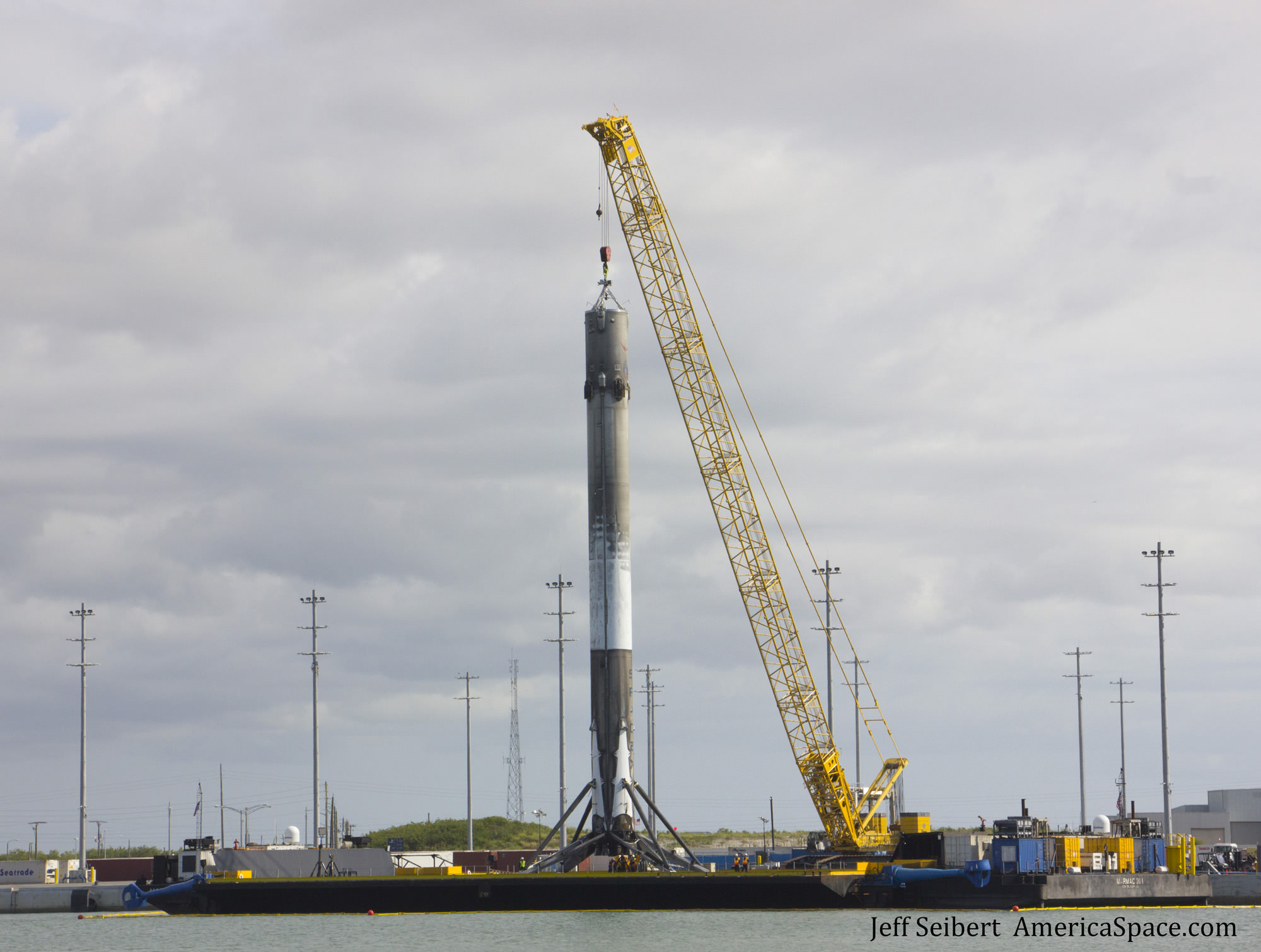 First stage booster from the SpaceX JCSAT-14 launch hoisted by crane on May 11, 2016 from drone ship to work pedestal on land 12 hours after arriving back in Port Canaveral, Florida. Credit: Jeff Seibert/AmericaSpace [/caption]