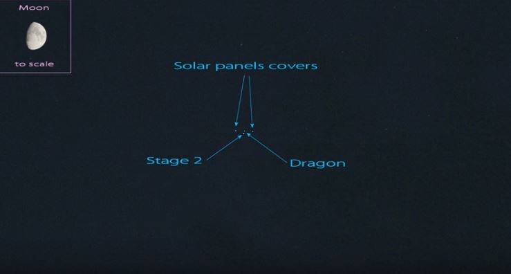 "You can see the Dragon, the second stage of the Falcon 9 rocket, and solar panel covers," Legault told Universe Today via email, "plus a nice surprise I discovered during processing: several fast ejections of material, certainly thrusters firing!"