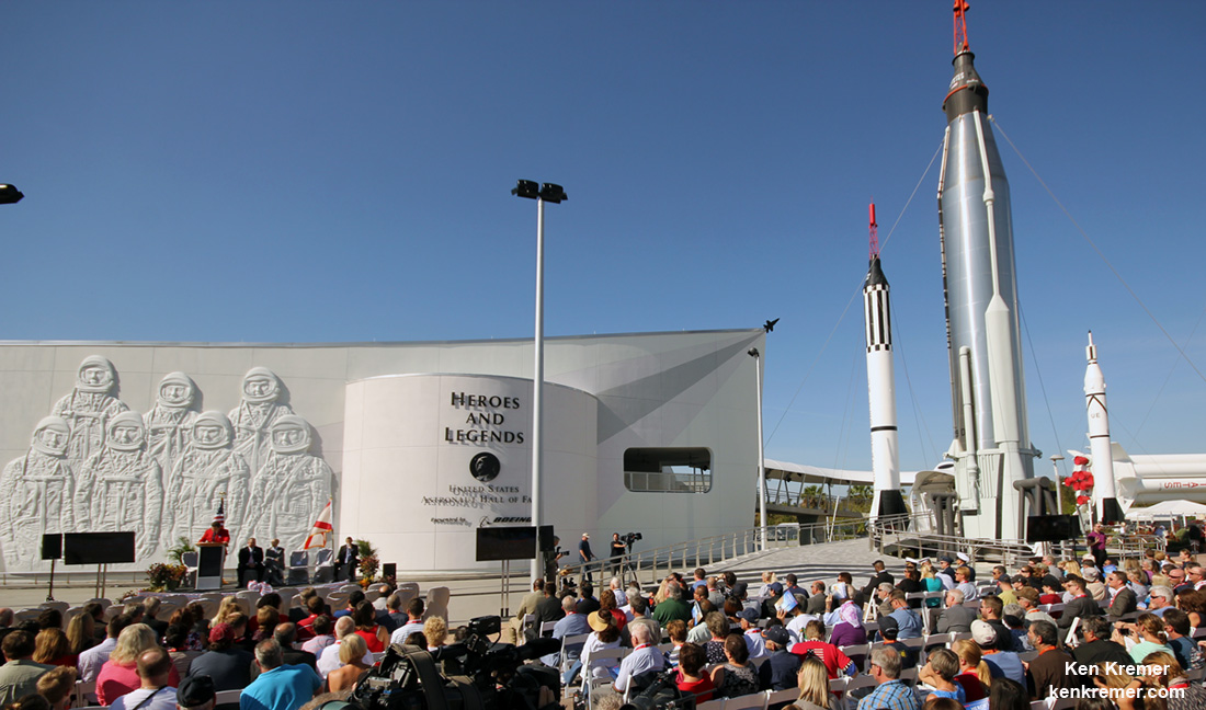 Grand opening ceremony for the 'Heroes and Legends' attraction on Nov. 11, 2016 at the Kennedy Space Center Visitor Complex in Florida and attended by more than 25 veteran and current NASA astronauts. It includes the new home of the U.S. Astronaut Hall of Fame, presented by Boeing. In addition to displays honoring the 93 Americans currently enshrined in the hall, the facility looks back to the pioneering efforts of Mercury, Gemini and Apollo. It provides the background and context for space exploration and the legendary men and women who pioneered the nation's journey into space. Credit: Ken Kremer/kenkremer.com[/caption]