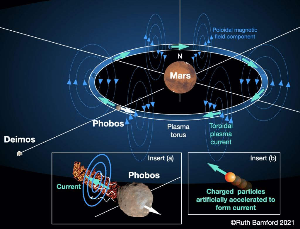 Phobos is the larger of the two Martian moons, and it orbits the planet quite closely. So closely that it makes a trip around Mars every 8 hours. So the team proposes using Phobos by ionizing particles from its surface, then accelerating them so they create a plasma torus along the orbit of Phobos. This would create a magnetic field strong enough to protect a terraformed Mars.