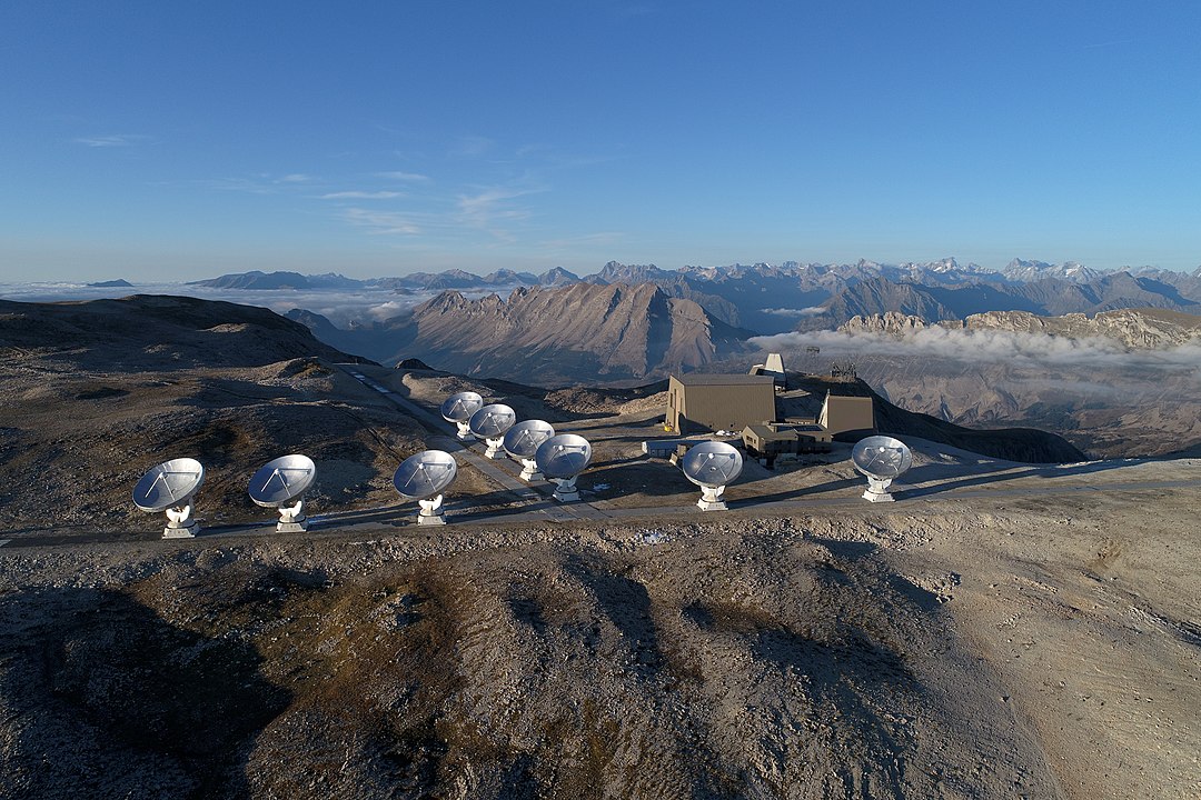 Aerial photo from Plateau de Bure NOEMA observatory showing 9 of 12, 15 metre antennae. During observations, the antennas work as a single telescope, a technique called interferometry (Credit : IRAM-gre)