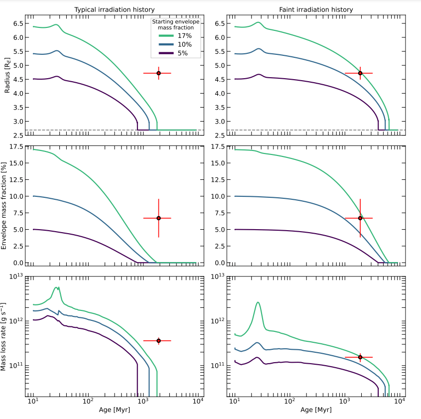 The researchers also modelled the planet's internal structure and how that affected its mass-loss history. They modelled the planet's radius, envelope mass fraction, and mass loss rate under two different XUV histories. One had an expected stellar emission history and one had a faint stellar emission history.