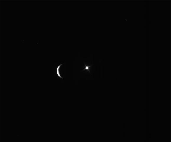 Iapetus, seen above as just a thin crescent, is best known for its two-toned appearance. One half of the 914-mile-wide moon is bright and icy, the other coated with a layer of dark reddish material, giving it a real "yin-yang" appearance. (Ok, I guess that's a
