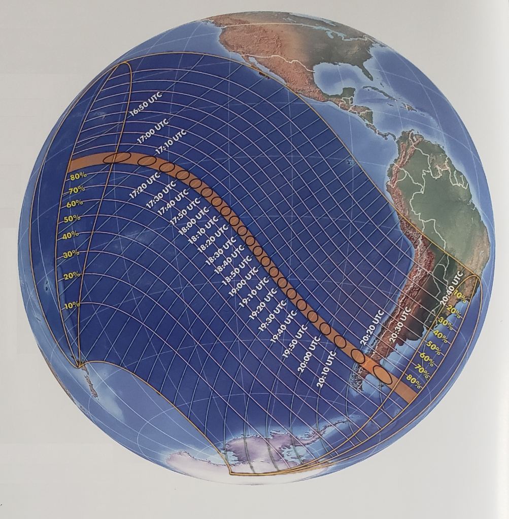 The partial phases of the eclipse will be visible from Antarctica and northern New Zealand, across southern South America all the way up to Brazil, Paraguay and Peru, up to a small sliver of the west Pacific coast of Mexico. The Falkland Islands in the Atlantic ocean will see a narrow miss, with Stanley seeing an 84% obscured partial eclipse.