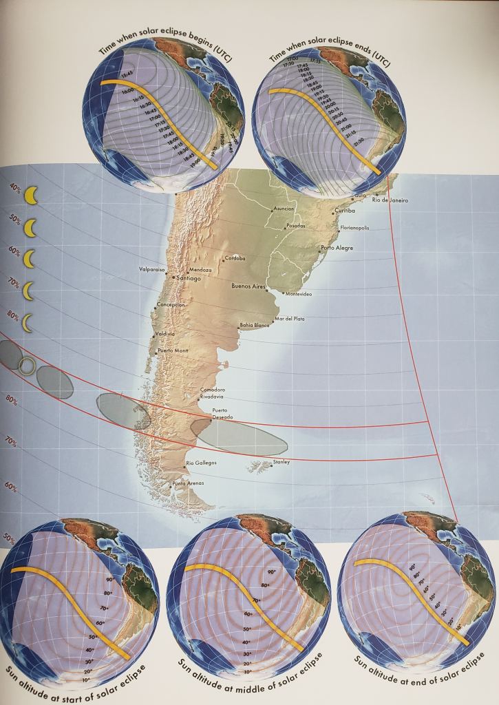 The path crosses the South Pacific, and only makes landfall across Easter Island, Chile, Argentina. Maximum annularity reaches 7 minutes and 25 seconds in duration northwest of Easter Island. There's a chance for some excellent 'horns of the Sun' shots towards sunset around to Falkland Islands and the Horn of South America.