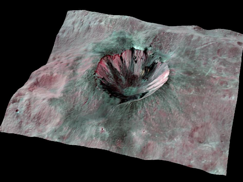 spacecraft has been capturing high-resolution images of the protoplanet's surface, revealing a surprisingly varied and complex terrain covered in ridges, hills, grooves and, of course, craters of many different sizes and ages. Many of Vesta's largest craters exhibit strange dark stains and splotches within and around them, some literally darker than coal. These stains were a puzzle to scientists when they were first seen, but the latest research now confirms that they may actually be the remains of the ancient impacts that caused them: dark deposits left by the myriad of carbon-rich objects that struck Vesta over the past four-and-a-half billion years.
