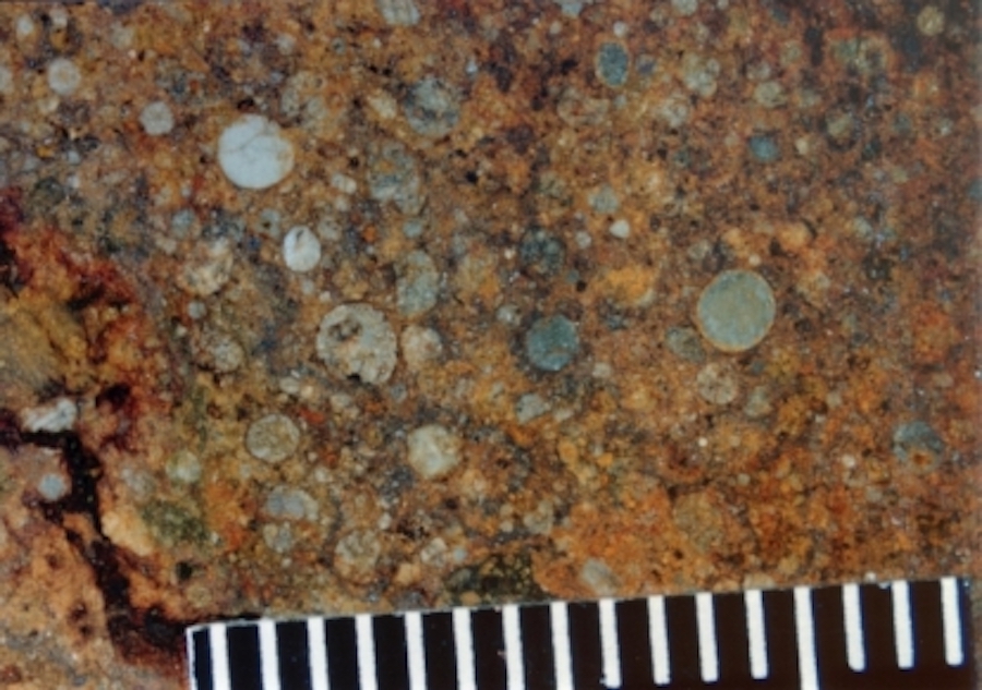 Chondrules in the chondrite classification Grassland. A millimetre scale is shown.