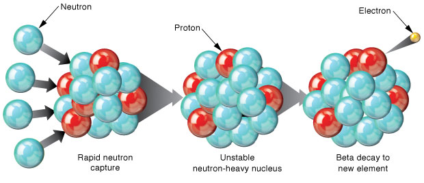 In addition to the r-process of rapid neutron capture, there are two other ways to create heavy atomic nuclei: the p-process where neutron-rich nuclei capture protons, and the s-process where a seed nucleus can capture a neutron. But neither of these can create a rapid build-up in mass necessary for elements beyond uranium. And it's only in the hypermassive first-generation stars that r-process nucleosynthesis could have generated such elements.