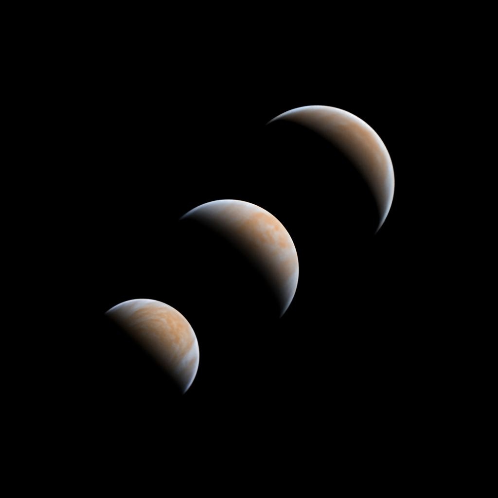 Here's another winner by Tom Williams in the UK! This false-color composite shows the phases of Venus on approach to inferior conjunction, which is when Venus and the Earth appear close on the same side of the Sun. Tom used ultra-violet and infrared filters, enabling view of the intricate cloud structure within Venus' upper atmosphere to be revealed. Williams explained that despite Venus's rotation period being many months long, the atmosphere is far from stationary, circling the planet in around four days. This makes UV imaging of Venus particularly interesting as the planet is much more dynamic than it otherwise would be if viewed in the visible spectrum.