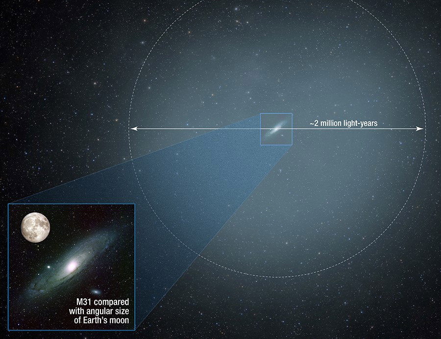 Astronomers have observed halos around 44 other galaxies but never one as massive as Andromeda where so many quasars are available to clearly define its extent. The previous 44 were all extremely distant galaxies, with only a single quasar or data point to determine halo size and structure.