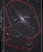 Image credit: RAS An international team of astronomers has used the UK's 2.5-m Isaac Newton Telescope on La Palma in the Canary Islands to map the Andromeda Galaxy (otherwise known as M31) and a large area of sky all around it. Their work over the last few years has created the most detailed image of a large spiral galaxy that currently exists. Dr Mike Irwin of the University of Cambridge, one of the team leaders, reports on some of the latest findings on Wednesday 31 March, when he will tell the RAS National Astronomy Meeting at the Open University about the first clear evidence that M31 is pulling one of its bright satellite galaxies apart, and the discovery of 14 previously unknown globular clusters orbiting far from the centre of M31 which could have been left behind when Andromeda devoured their parent galaxies.