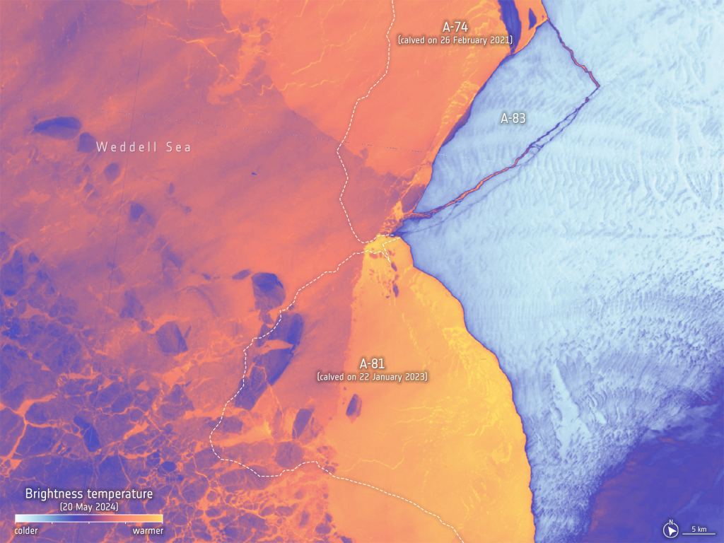On May 20th, 2024, an iceberg measuring 380 square kilometers (~147 mi2) broke off the Brunt Ice Shelf in Antarctica. This event (A-83) is this region's third significant iceberg calving in the past four years. The first came In 2021, when A-74 broke off the ice sheet, while an even larger berg named A-81 followed in 2023. The separation of this iceberg was captured by two Earth Observation satellites - the ESA's Copernicus Sentinel-1 and NASA's Landsat 8 satellites - which provided radar imaging and thermal data, respectively.