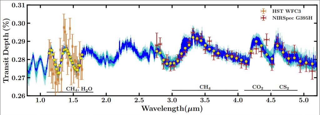 The atmospheric spectrum also contains hints of C2H6(ethane.) Ethane can be a byproduct of photochemical reactions involving methane and other gases, including biogenic ones. Its presence is another indication that methane is present. The researchers also point out that the abundances of ethane and carbon disulphide are well above theoretical predictions. "More observations are required to robustly constrain the presence and abundances of both molecules," they write.