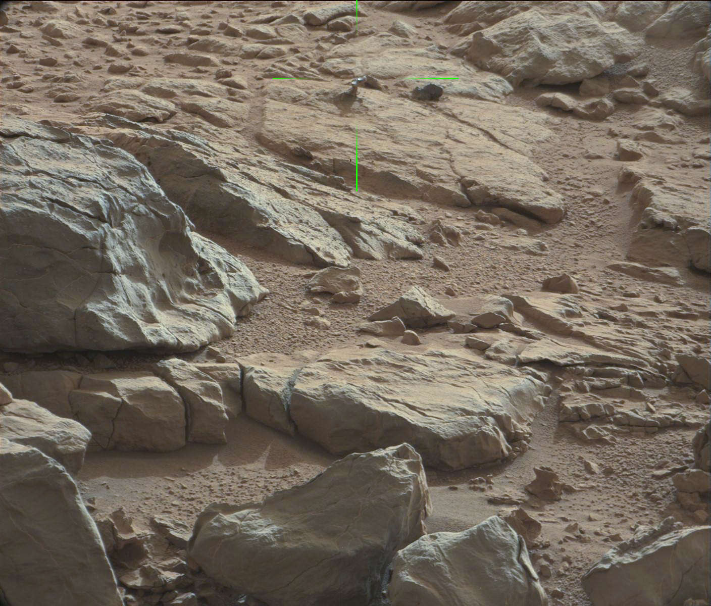 in the Martian soil. Now the rover has imaged a small metallic-looking protuberance on a rock. Visible in the image above (the green lines point to it), the protuberance appears to have a high albedo and even projects a shadow on the rock below. The image was taken with the right Mastcam on Curiosity on Sol 173 -- January 30, 2013 here on Earth -- (