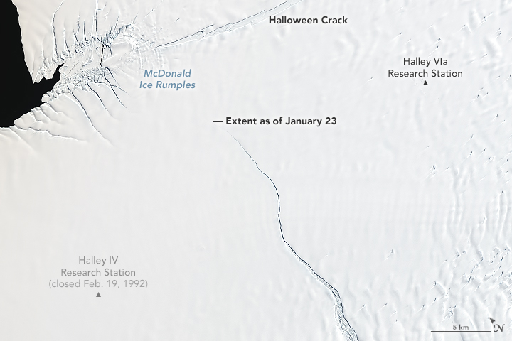 "We don't have a clear picture of what drives the shelf's periods of advance and retreat through calving," said NASA/UMBC glaciologist Chris Shuman. "The likely future loss of the ice on the other side of the Halloween Crack suggests that more instability is possible, with associated risk to Halley VIa."
