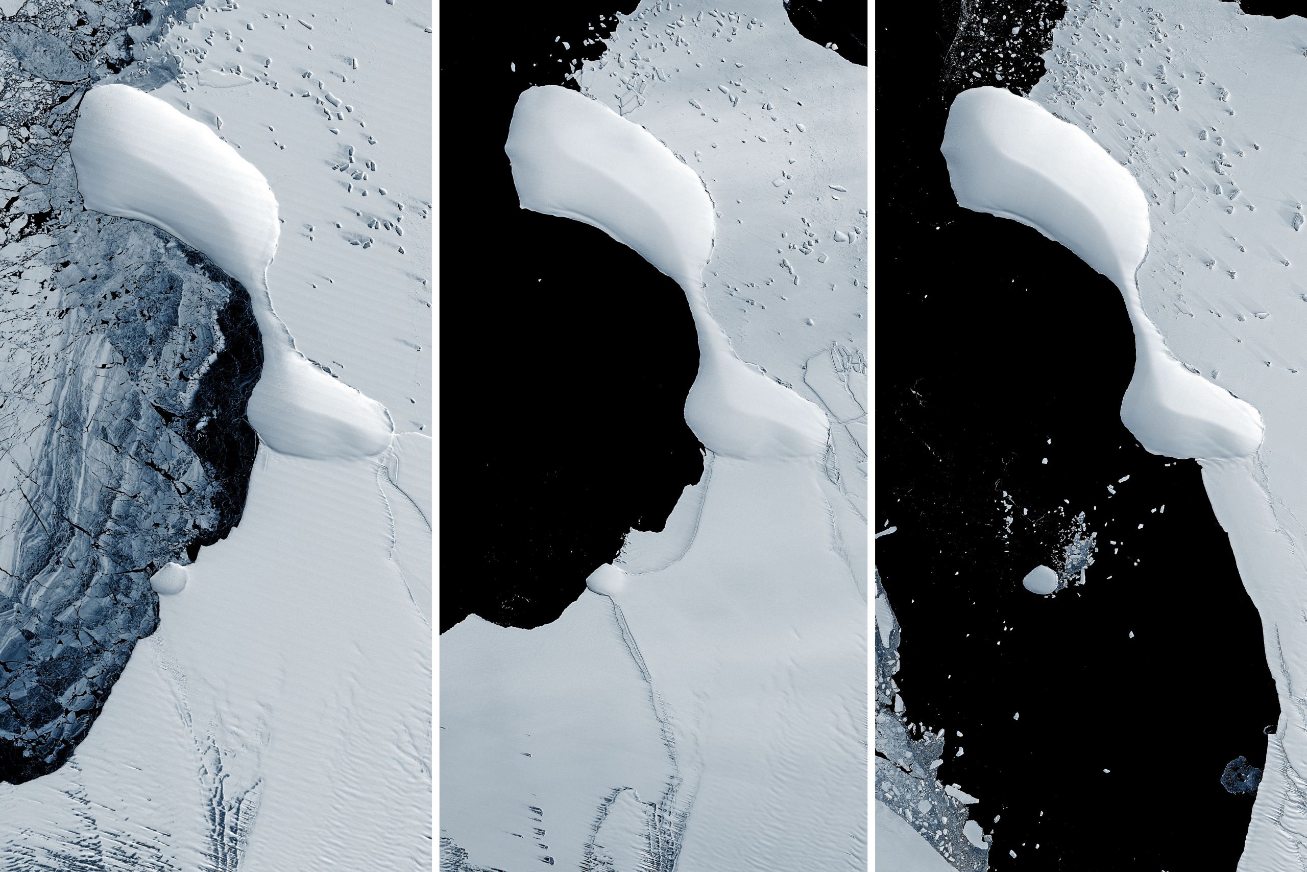 The island is visible in the three images, which were taken by Landsat satellites between 1989 and 2022. The landform maintains its shape, even through the ice around it has melted, shifted, and disappeared. With the collapsing ice, scientists think large icebergs likely smashed into the island, but the island maintained its shape.